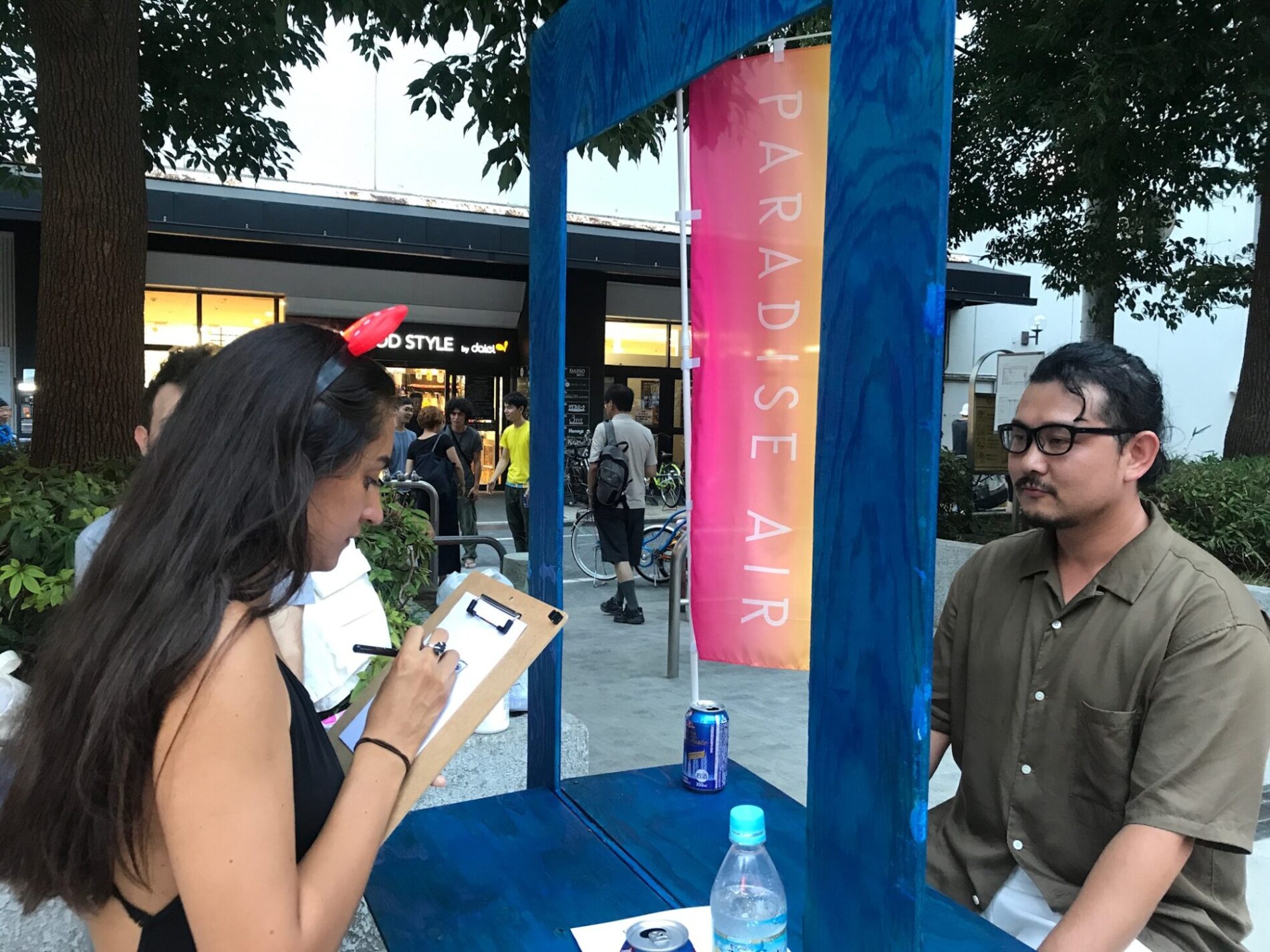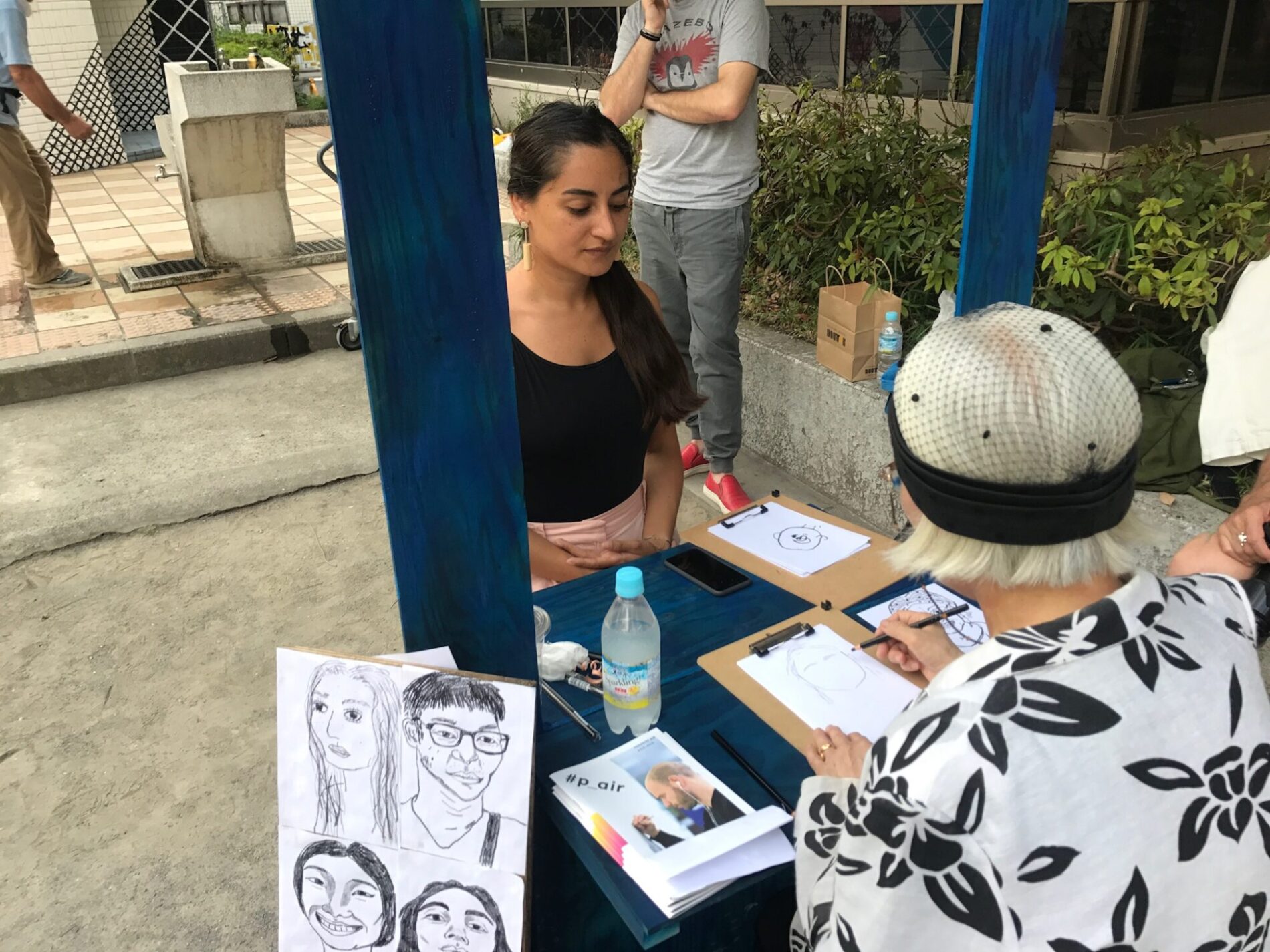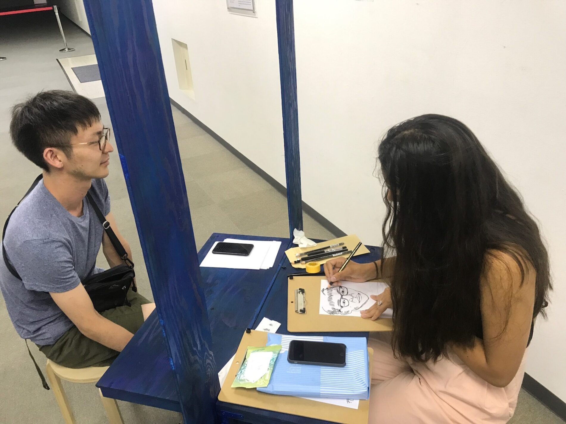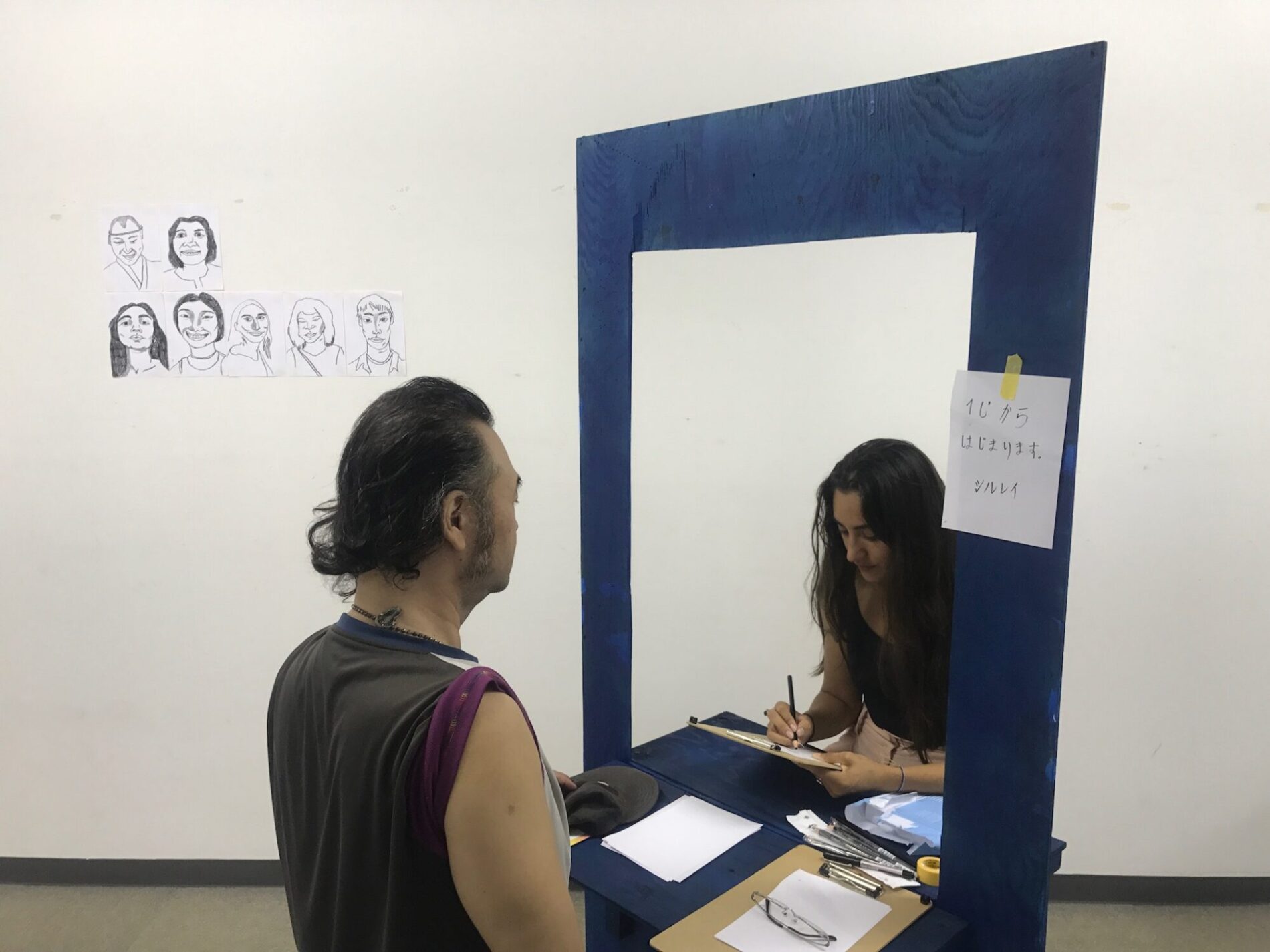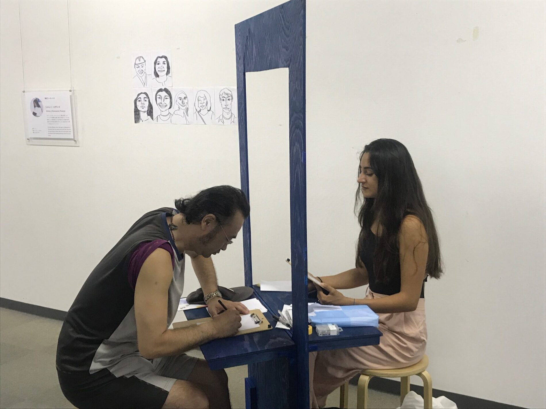 After three weeks traveling around Japan the artist came to notice that Japanese people live in a individualistic society. Therefore, for the Japanese as an individual, it is difficult to make contact with others. Interactions between strangers is rarely spontaneous in Japan. Most Japanese people tend to keep others at a safe distance, without noticing it themselves. They don’t want to disturb people, which keeps them from meeting others. As a foreigner in Japan the artist discovered that Japanese people don’t have difficulties to open up to her. Based on these experiences the artist creates a meeting place named: Hajimemashite. It is an installation where people can portray. The artist commences a portrait and asks the spectator to complete it. This way the spectator finishing the drawing comes into contact with the model. It doesn’t matter if the spectator has a talent for drawing or not. It’s all about the interaction, the eye contact, experience the presence of someone else and the intimacy that exists while making a portrait. The latter is the link the artist makes with her own work. Her work revolves around portraits of people coming to pose in her personal studio. In this process the model exposes itself witch creates a moment of intimacy.